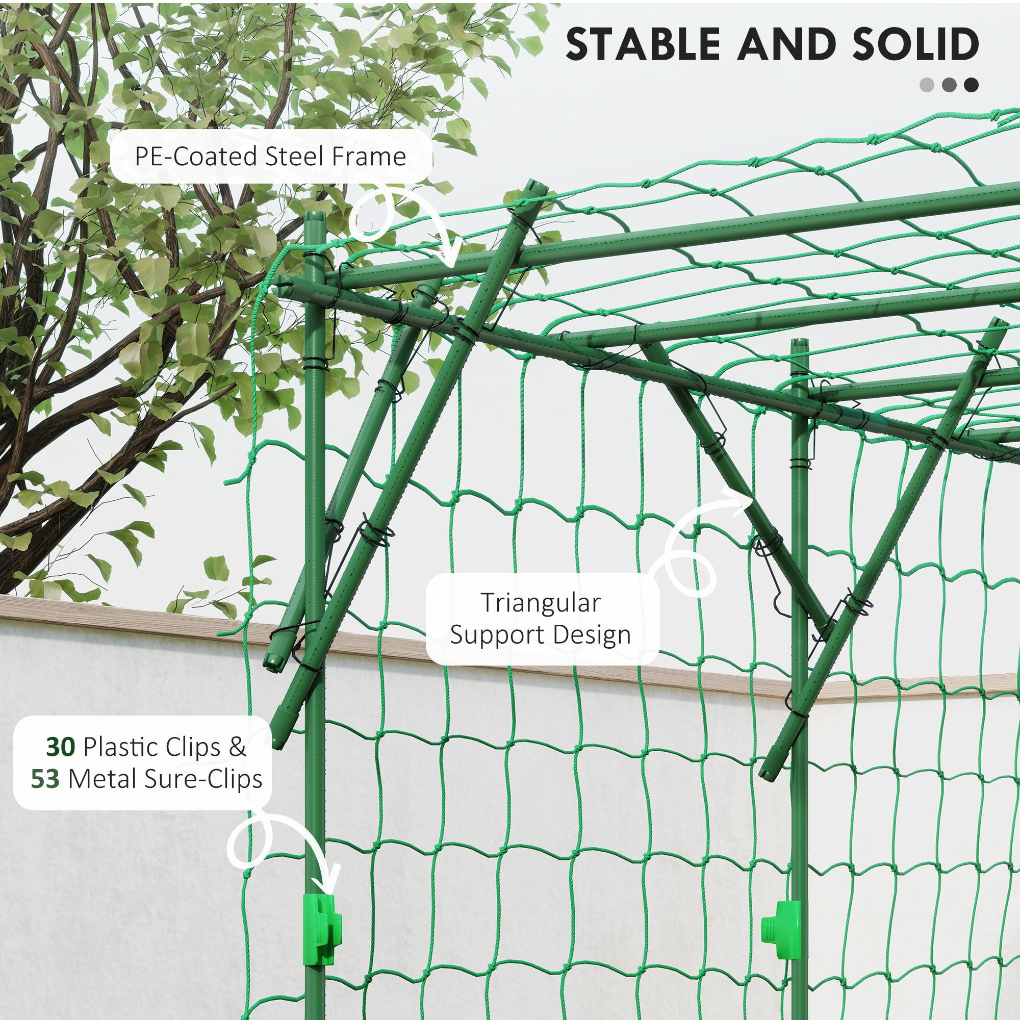 La structure en acier recouvert de polyéthylène assure une excellente résistance aux intempéries et une durabilité accrue. Le support triangulaire combiné aux clips de fixation renforce la stabilité de l’ensemble, même lorsque les plantes deviennent plus volumineuses.