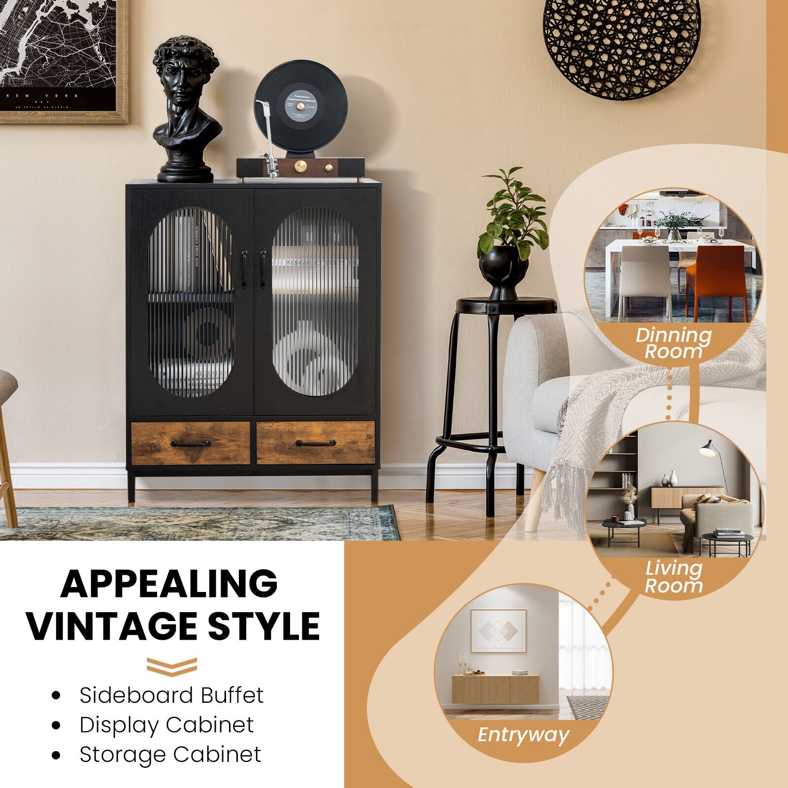 Confort et design : Ce buffet de rangement se distingue par son style industriel moderne qui s’intègre facilement à tout type de décoration intérieure. Les portes en verre trempé ondulé apportent une touche visuelle unique en diffusant la lumière de façon élégante, tandis que l’association du noir et du brun rustique crée un effet à la fois chic et contemporain.