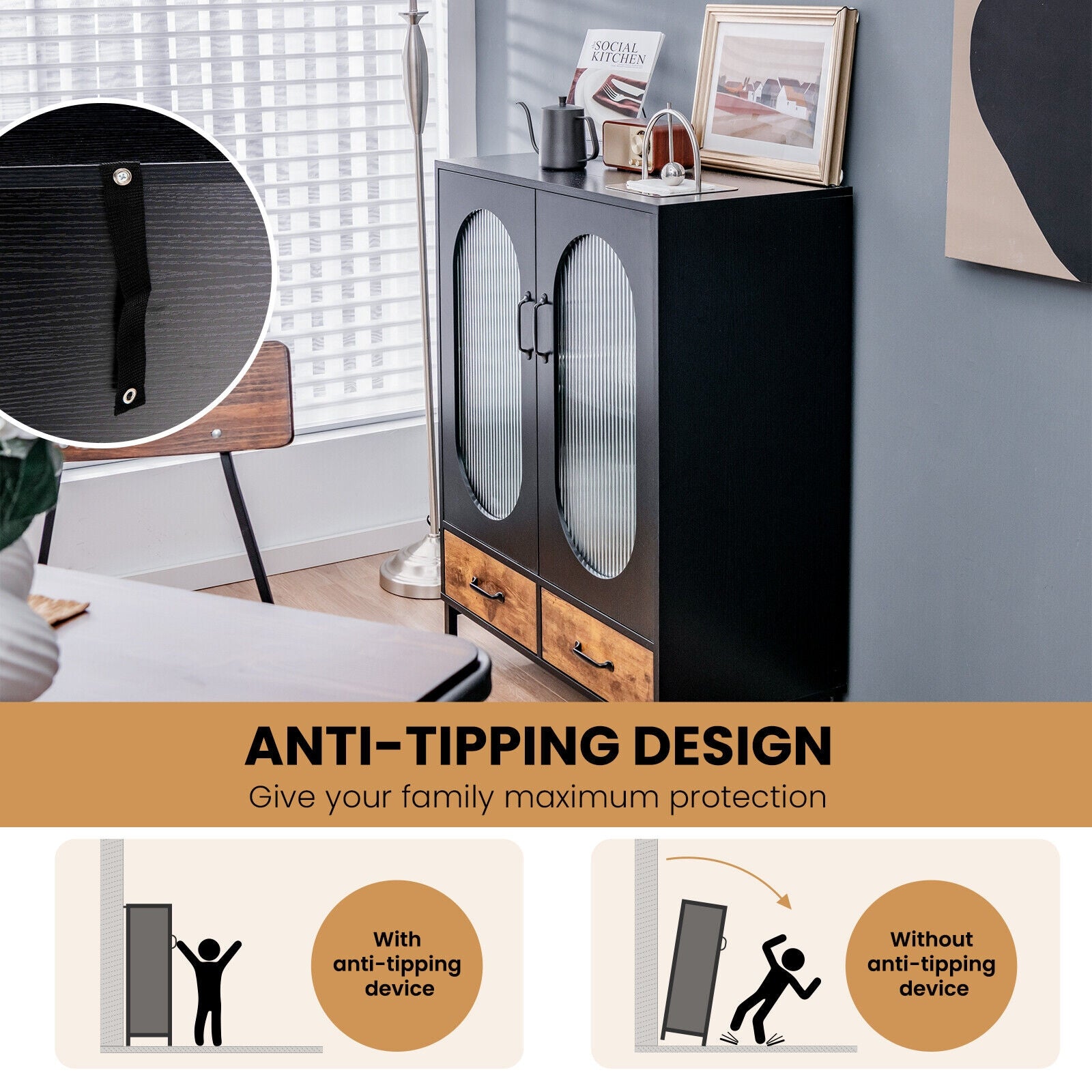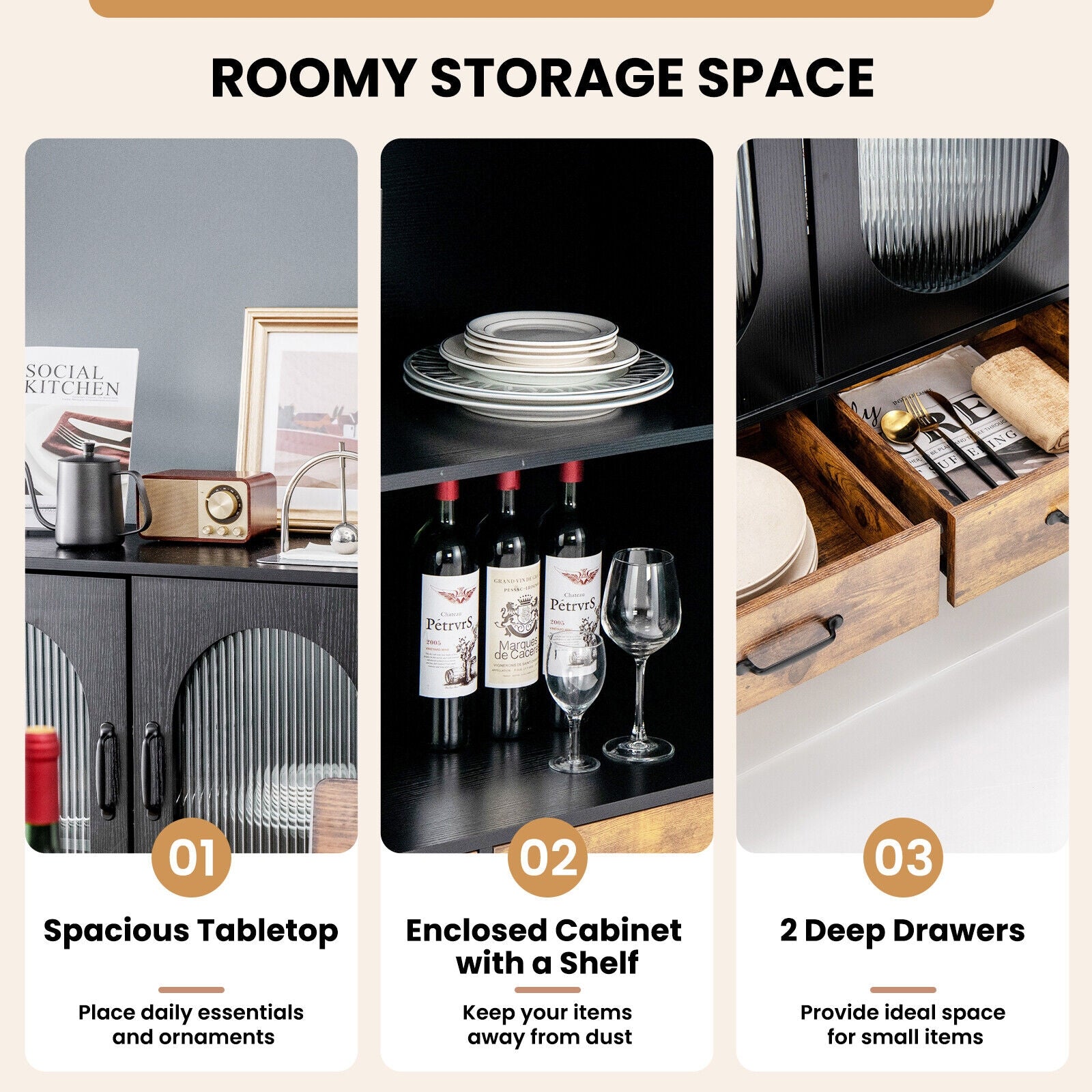 Montage et entretien : L’installation est simple grâce aux instructions détaillées et aux accessoires inclus. La surface étanche et le dégagement de 4 pouces sous le meuble facilitent le nettoyage et l’entretien quotidien, permettant de conserver le buffet et le sol propres sans effort.