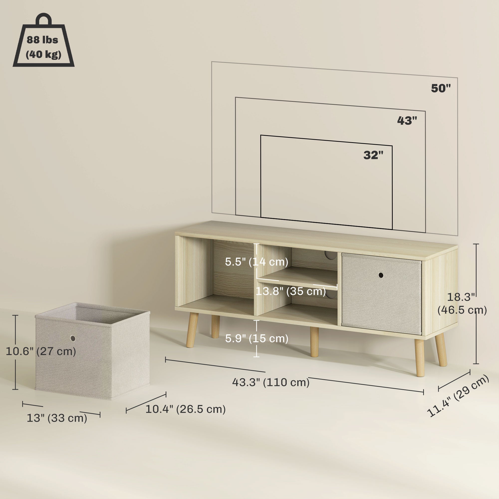 Fonctionnel et stable : Le plateau supérieur peut accueillir un téléviseur ou un écran jusqu’à 50 pouces. Les cinq pieds en bois inclinés assurent stabilité et durabilité, tandis que les trous à l’arrière facilitent la gestion discrète des câbles pour un rendu propre.