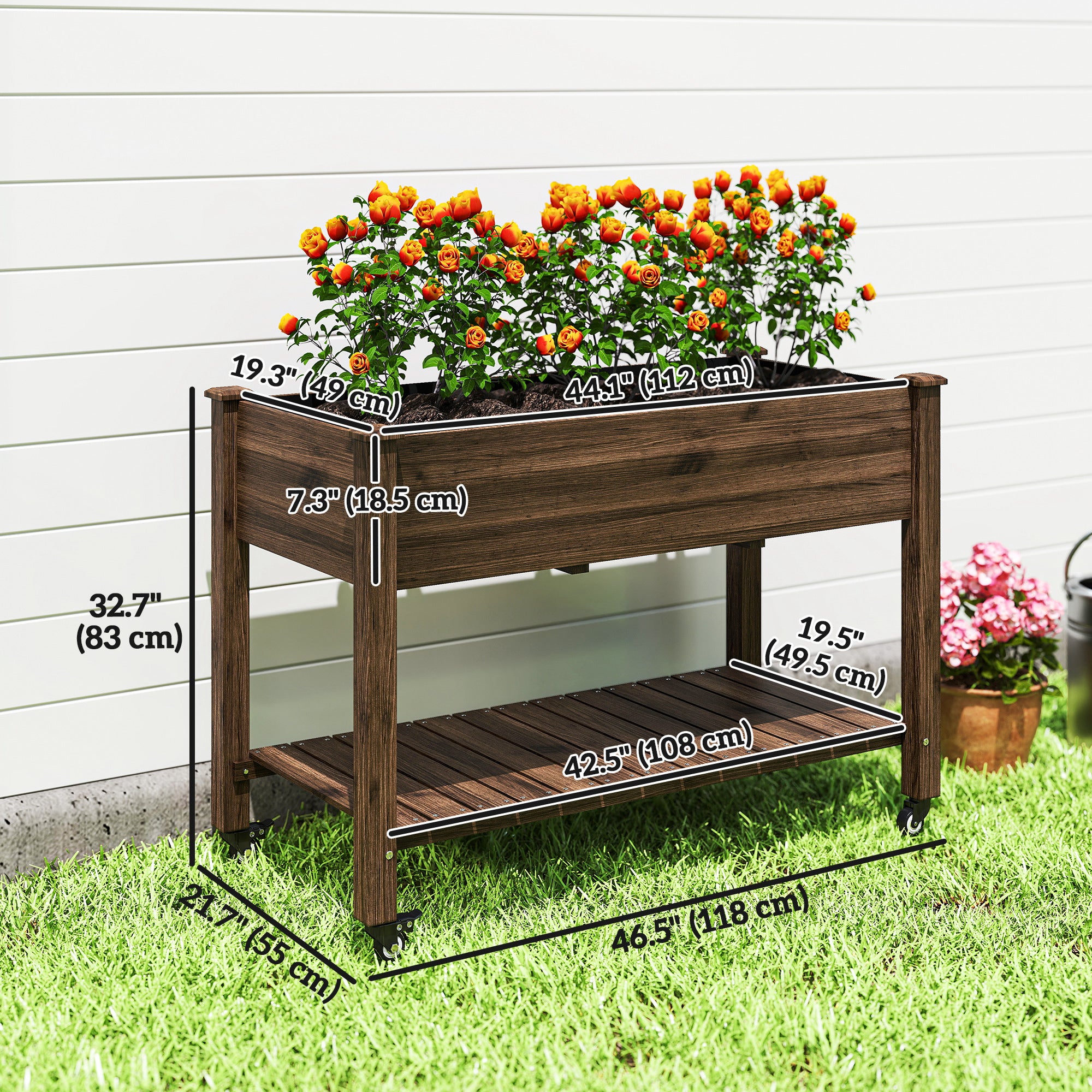 Potager surélevé en bois avec étagère et roulettes