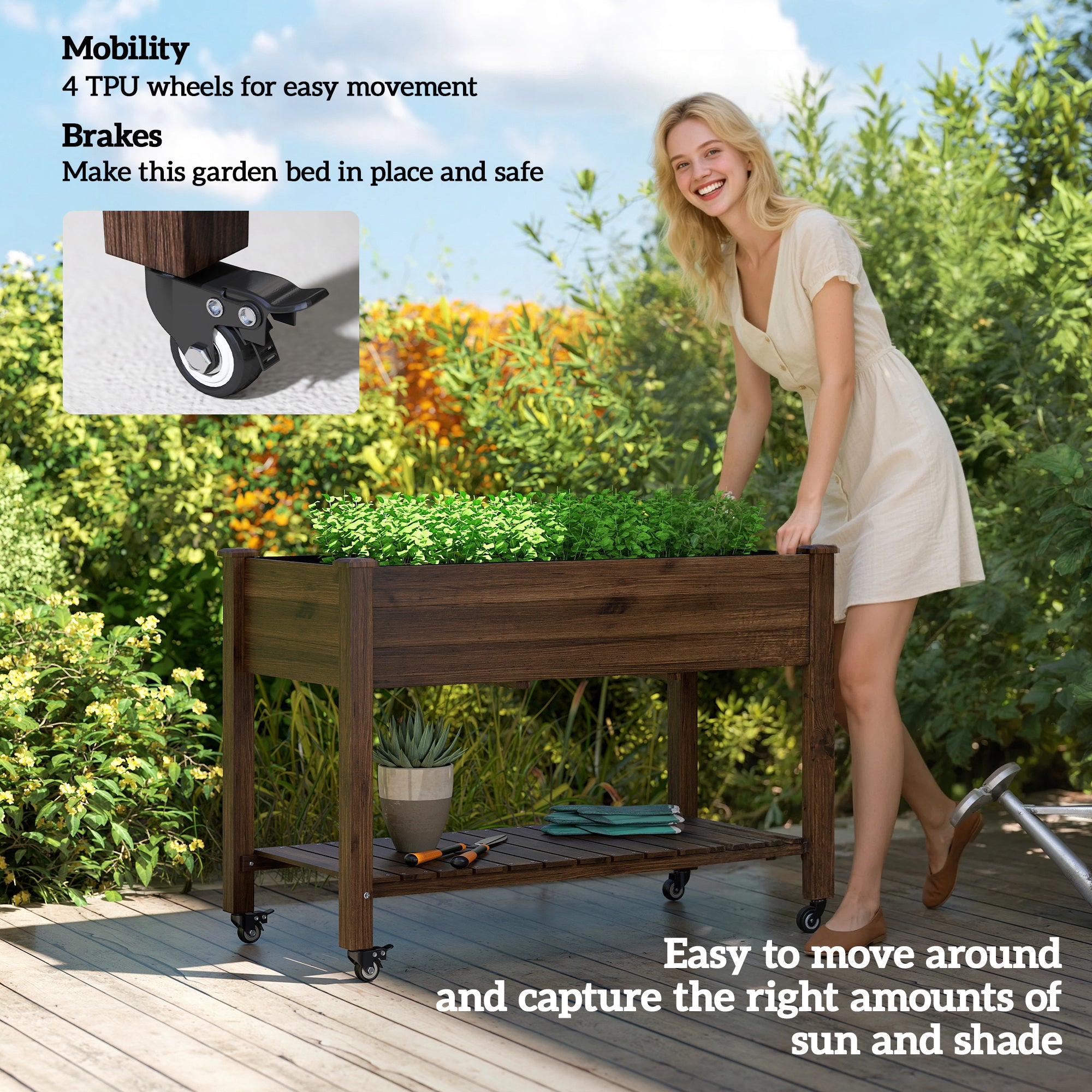 Ce potager surélevé apporte une touche rustique et chaleureuse à votre espace extérieur tout en améliorant considérablement le confort de jardinage. Sa hauteur idéale permet de jardiner sans se baisser, réduisant la fatigue du dos, tandis que sa structure sur roulettes facilite les déplacements selon l’ensoleillement ou l’aménagement souhaité.