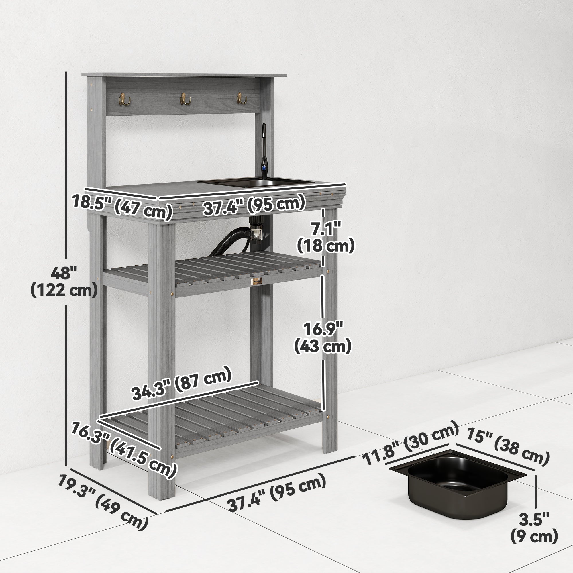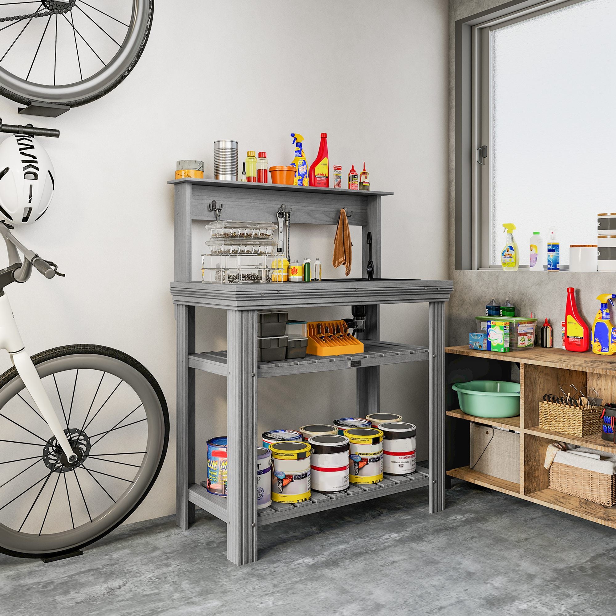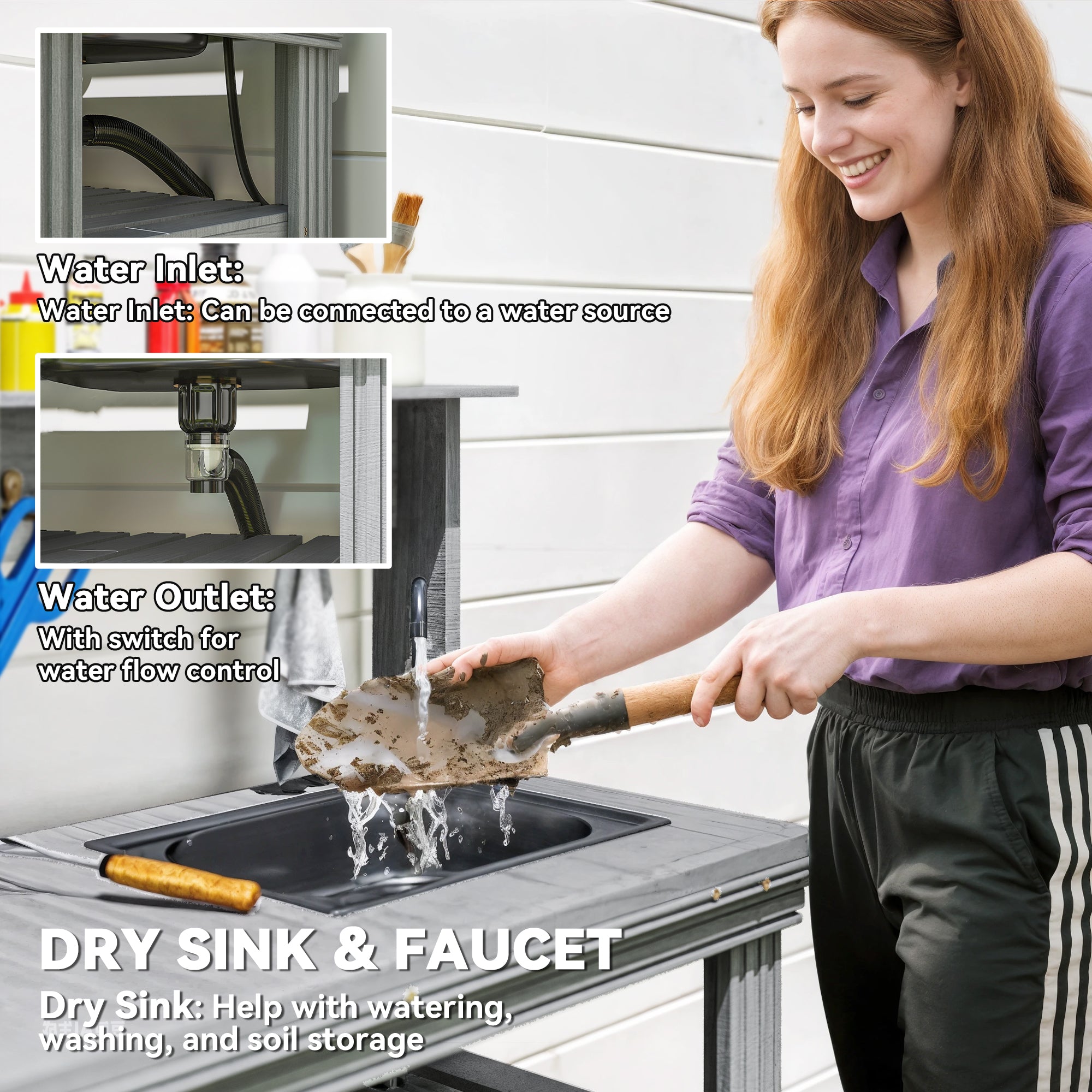 Équipé d’un évier sec et d’un robinet en métal, ce poste de préparation extérieur facilite le lavage des mains, l’arrosage et les tâches de jardinage quotidiennes. Les crochets et étagères intégrés offrent un espace de rangement généreux pour garder outils et accessoires à portée de main.