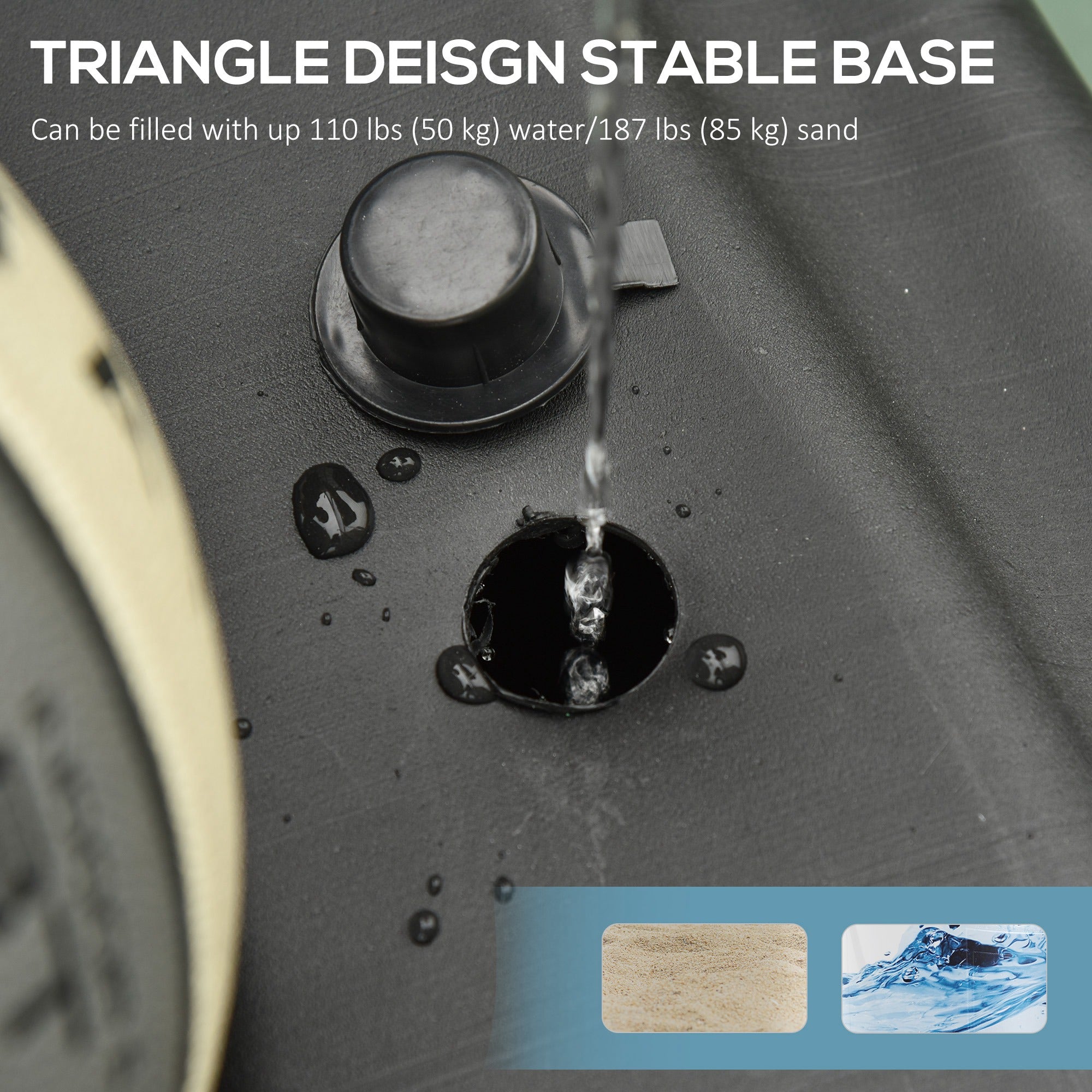 - Capacité de la base : jusqu’à 85 kg (187 lb) de sable ou d’eau