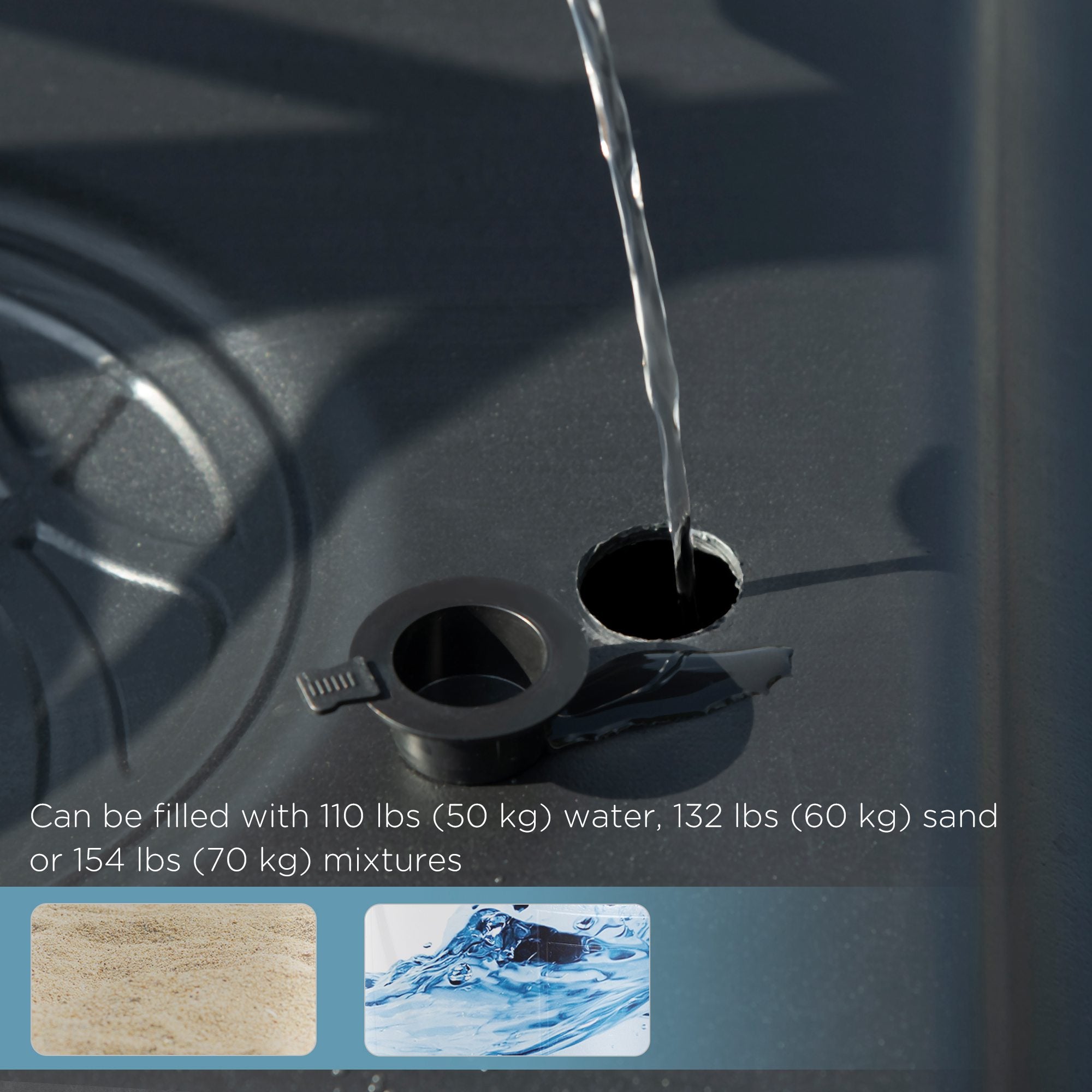 - Capacité de la base : 50 kg (110 lb) d’eau, 60 kg (132 lb) de sable ou 70 kg (154 lb) d’eau et de sable combinés