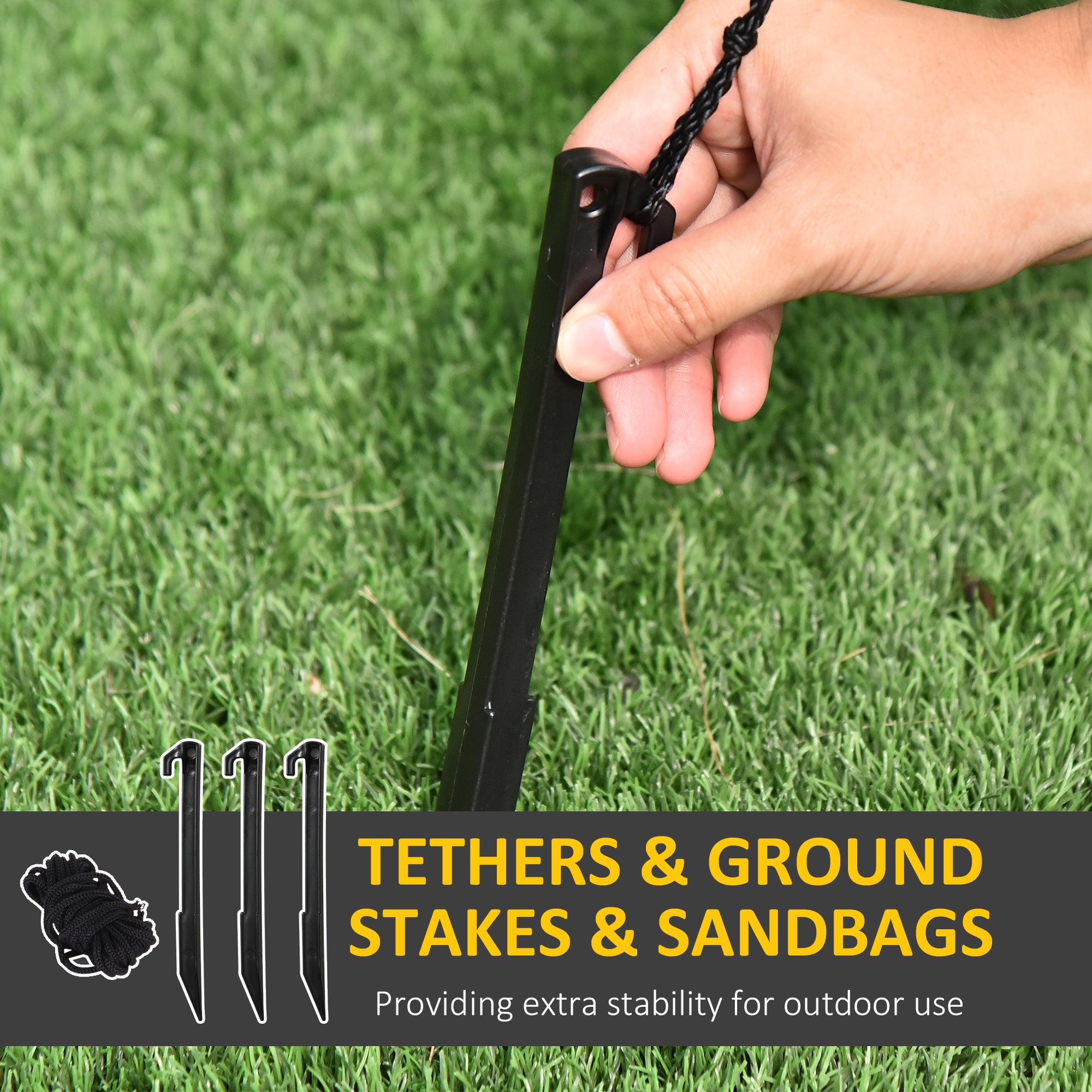Stable et durable : Conçu en polyester résistant aux intempéries (certifié IP44), il est livré avec piquets, cordes d’attache et sacs de sable pour rester bien en place, même par vent léger.