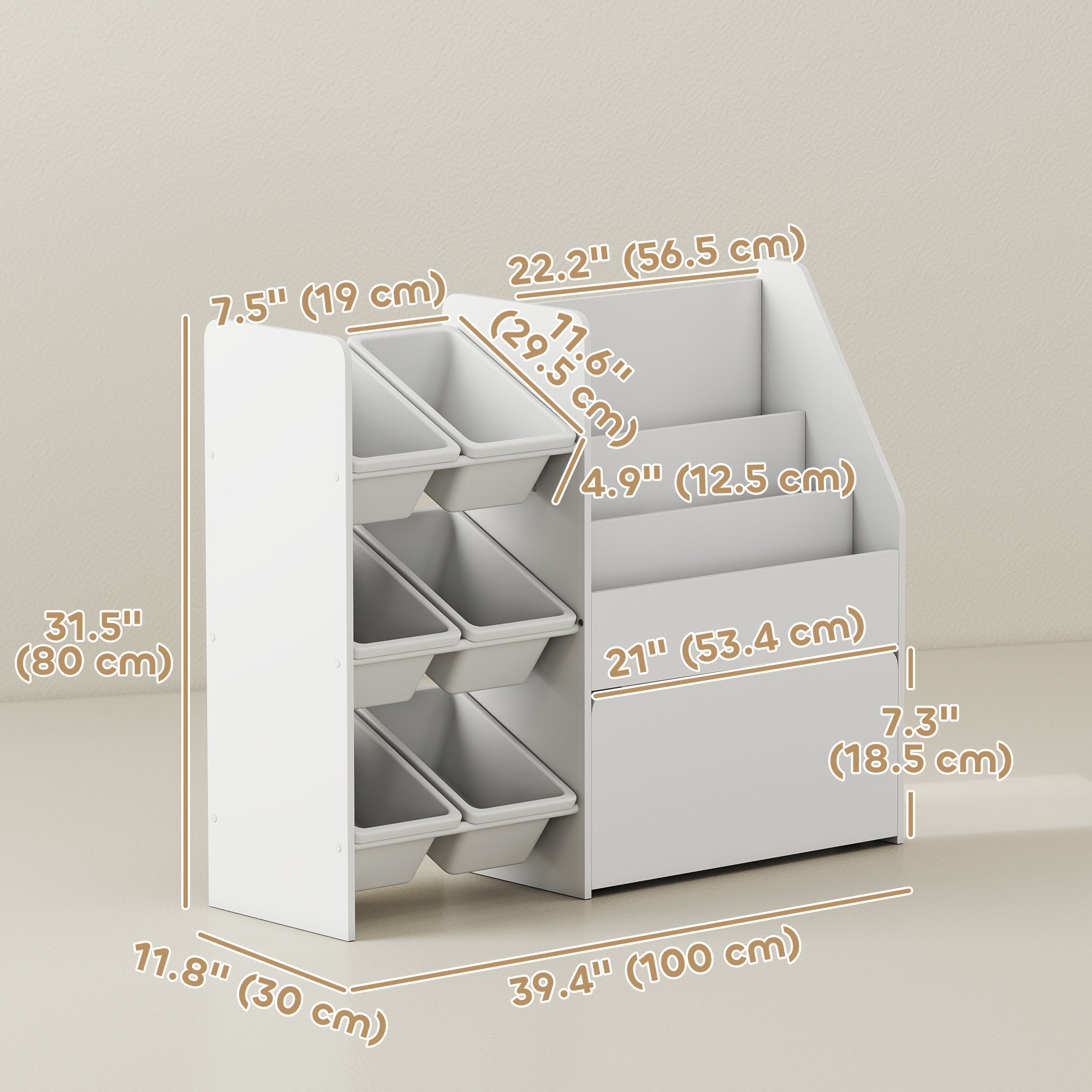Doté de plusieurs zones de rangement bien définies, ce meuble comprend des étagères à livres orientées vers l’avant, six bacs pour le tri des jouets et une grande boîte roulante pour un rangement rapide et ludique. Il permet aux enfants de classer facilement leurs jouets, livres et accessoires tout en rendant le rangement amusant et accessible.