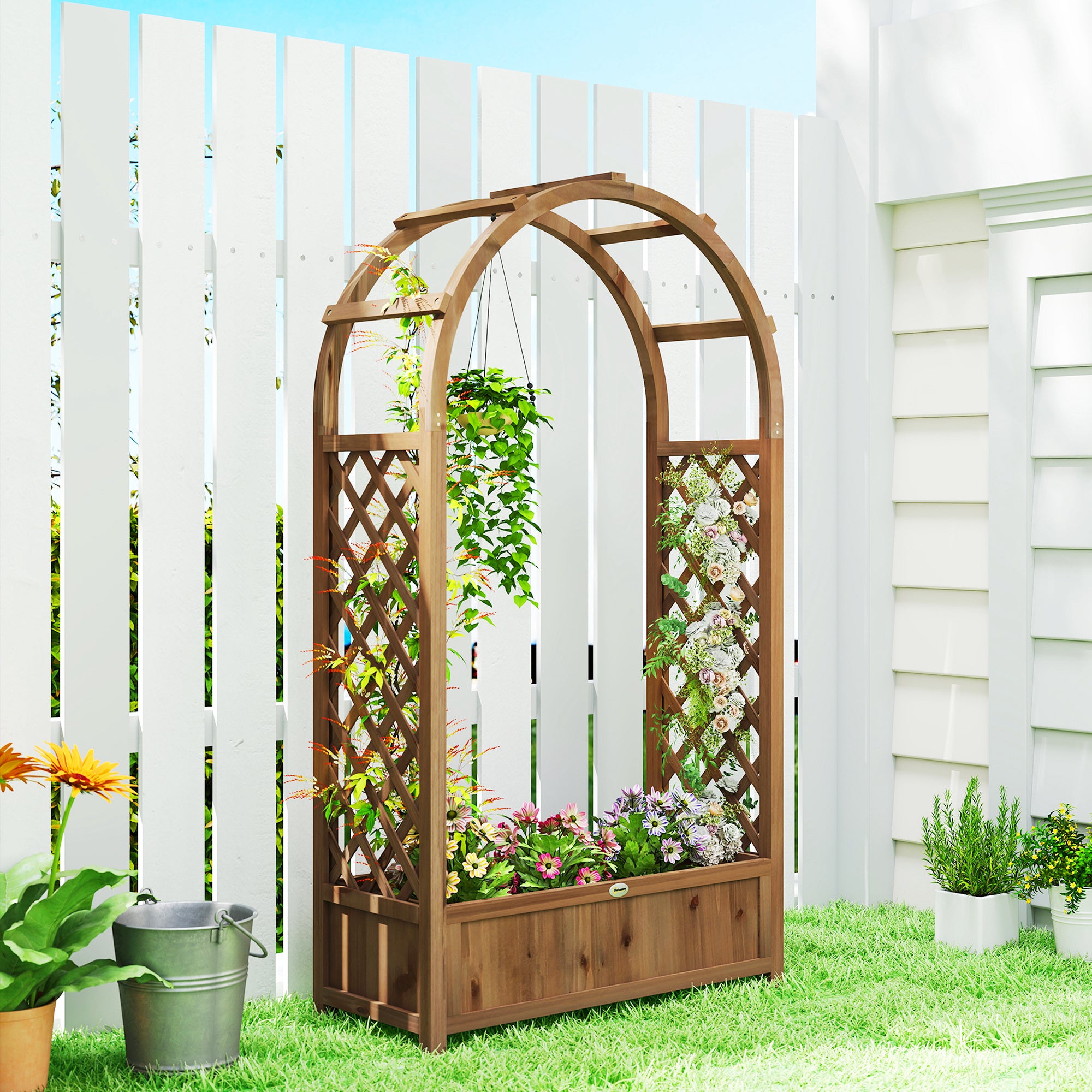 Bac à fleurs surélevé avec arche et treillis décoratif