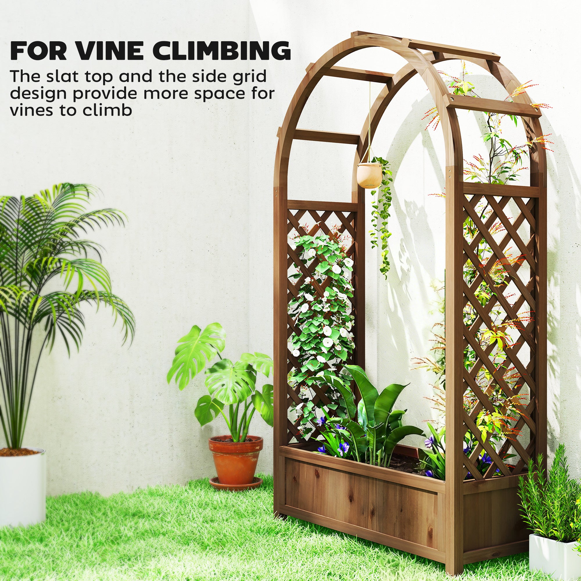 Conçu pour les plantes grimpantes, les vignes ou les pots suspendus, il peut également être décoré pour des événements avec des fleurs, des lumières ou d’autres éléments légers. Sa jardinière spacieuse permet de cultiver fleurs, légumes et plantes décoratives dans un même espace.