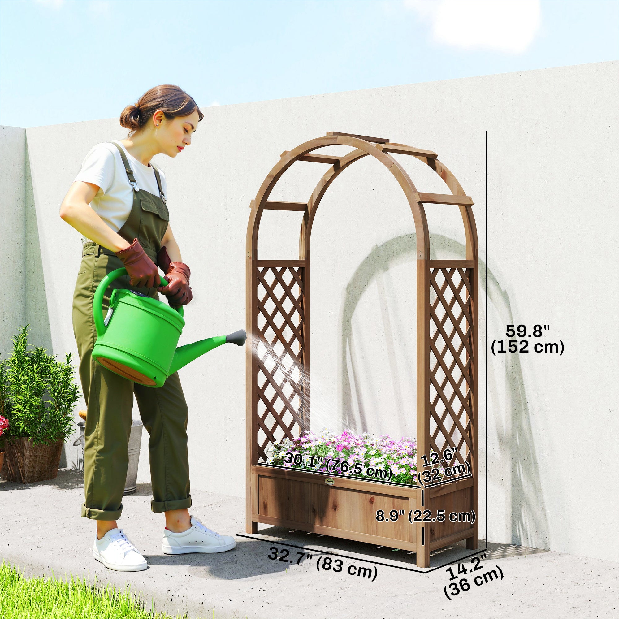 Ce bac à fleurs surélevé apporte une touche de charme naturel et élégante à votre jardin. Son arche supérieure et ses treillis latéraux créent un point focal décoratif idéal pour accueillir vos invités tout en mettant en valeur vos plantes grimpantes et compositions florales.