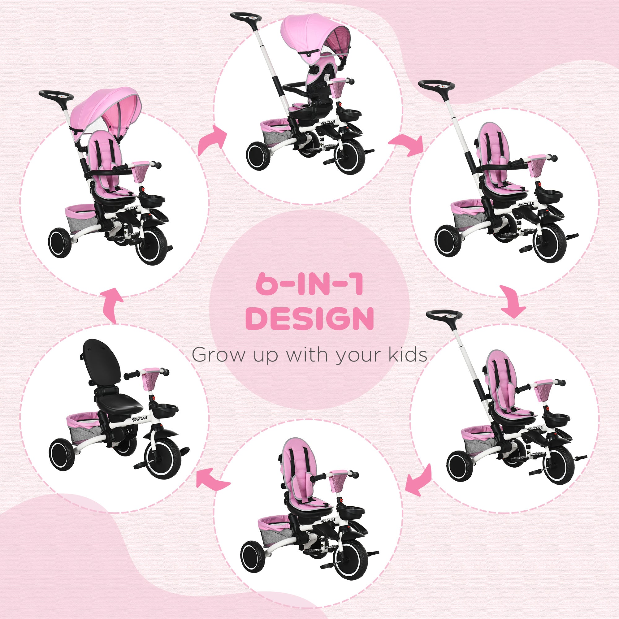 Tricycle évolutif 6 en 1 rose et blanc pour enfants avec auvent réglable et poignée parentale