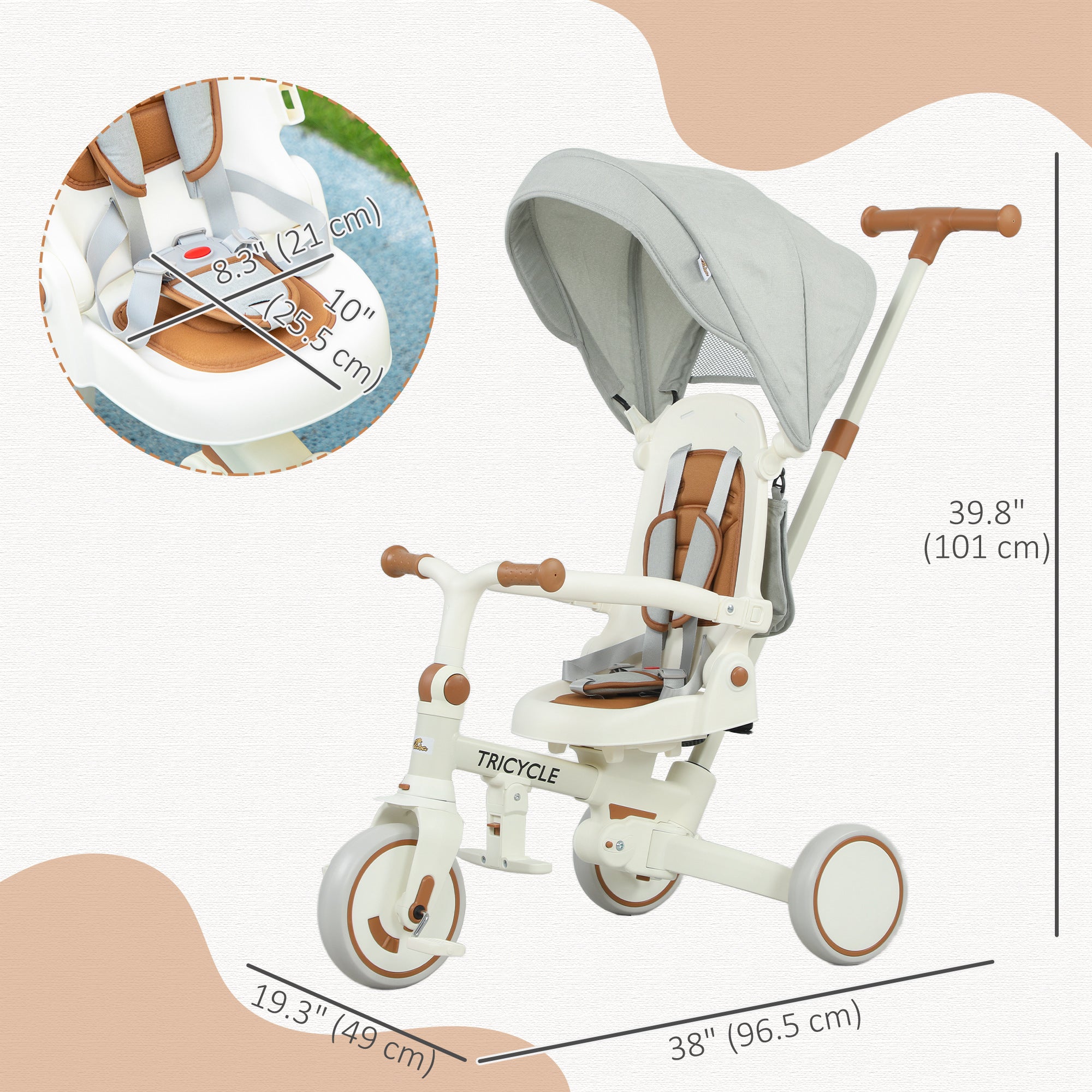 Tricycle évolutif 7 en 1 blanc crème pour enfants avec harnais de sécurité et pliage compact