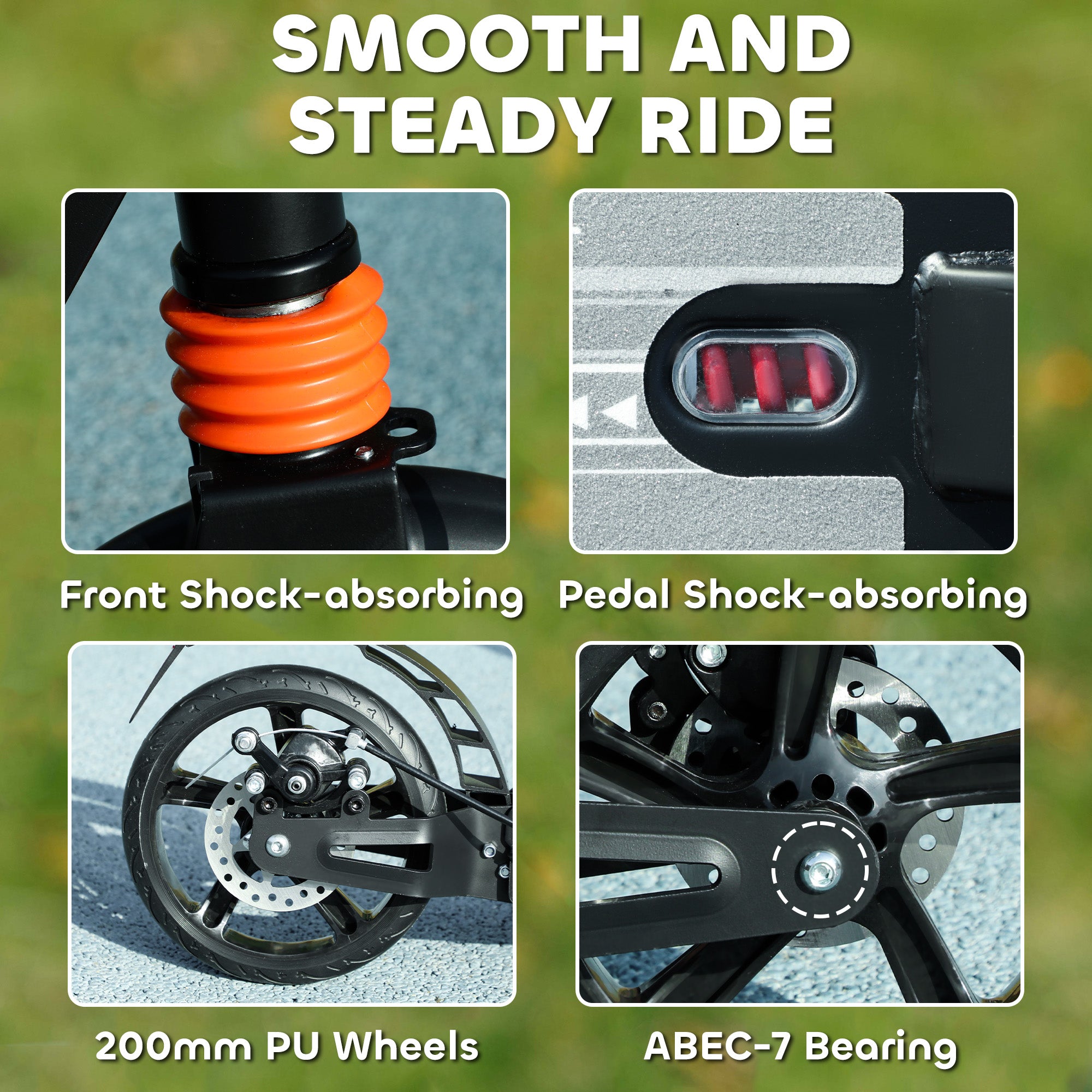 Sécurité renforcée : Le système de freinage double assure des arrêts sûrs et précis, tandis que les doubles amortisseurs garantissent une conduite stable, même sur des terrains irréguliers.